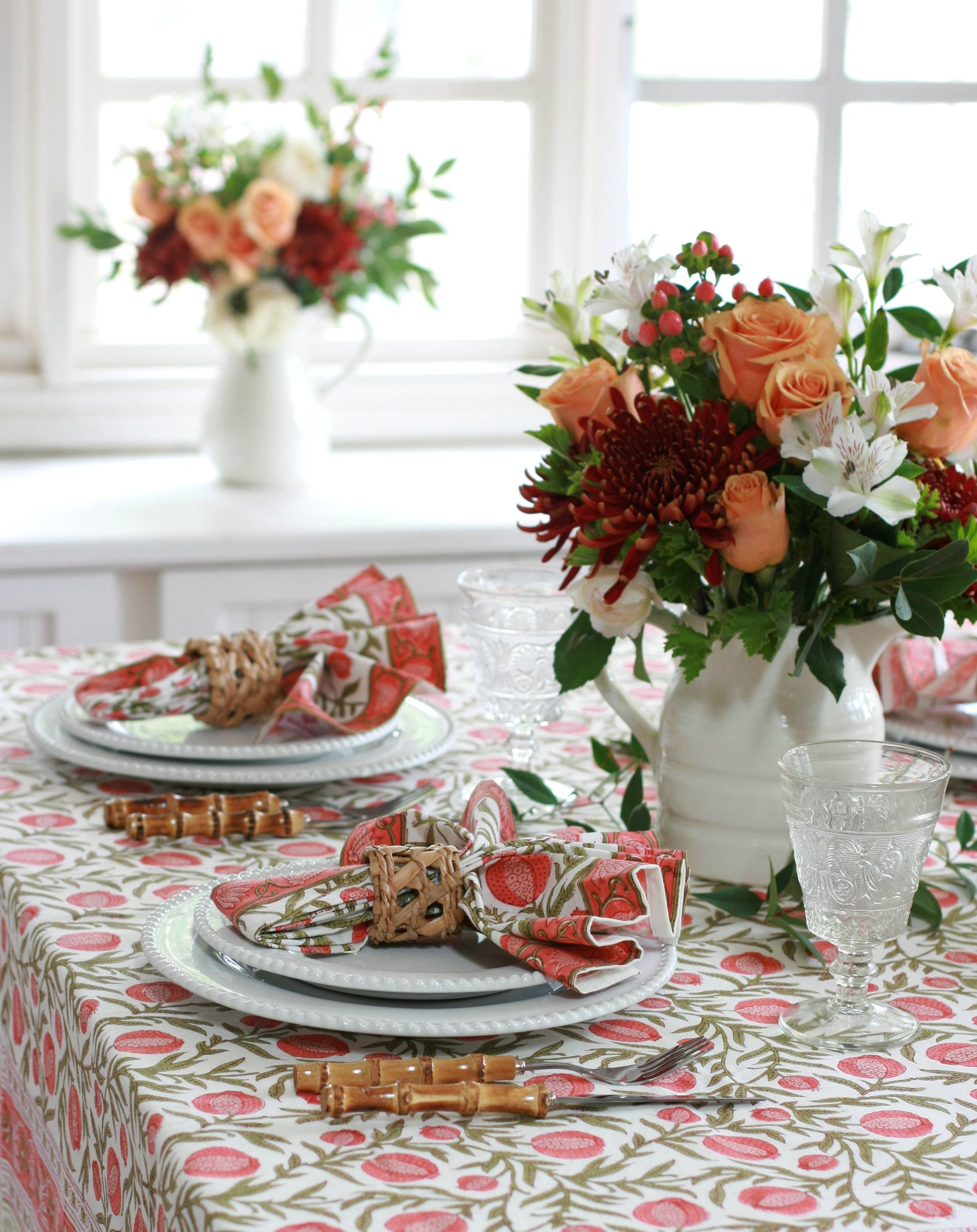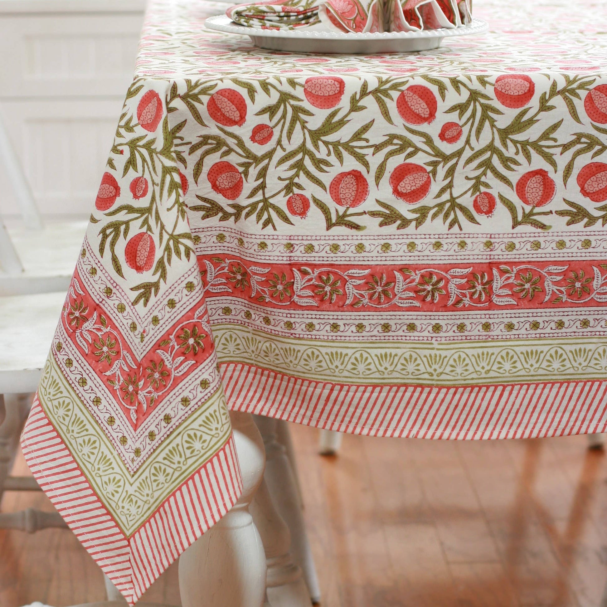 Our best-selling Pomegranate Red tablecloth is block-printed in warm shades of red with olive green leaves.